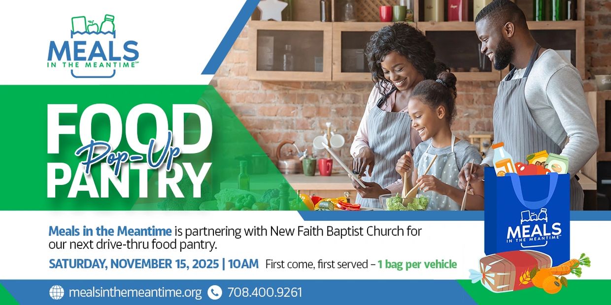 Meals in the Meantime is partnering with New Faith Baptist Church-International for our next drive-thru, pop-up food pantry on Saturday, November 15, 2025, 10am, at 25 Central Avenue, Matteson, Illinois 60443. Fresh, healthy, and high-quality grocery bags are available for all who need help with food (first come, first served, one bag per vehicle).