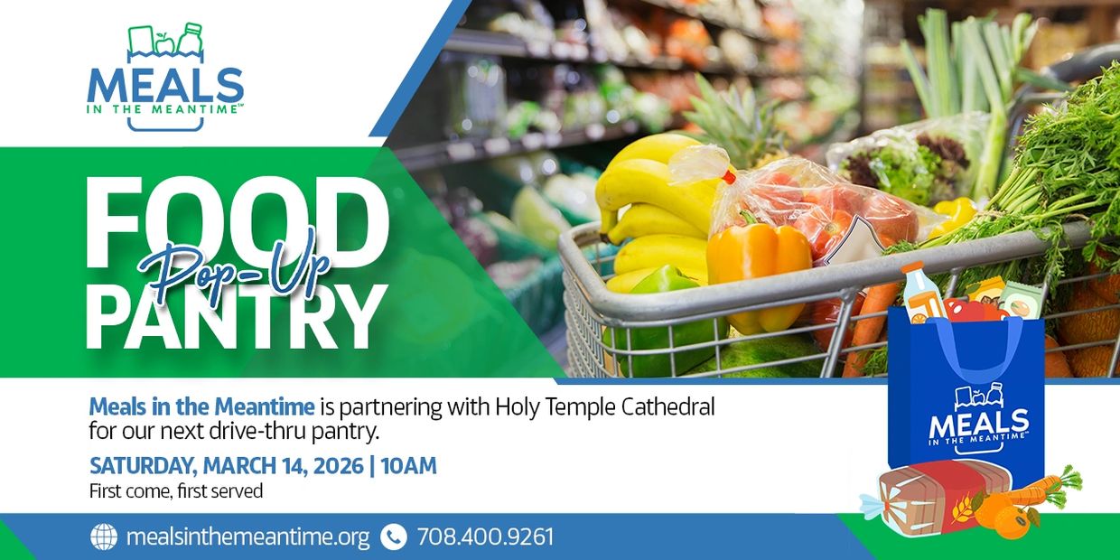 Meals in the Meantime is partnering with Holy Temple Cathedral for our next drive-thru food pantry on Saturday, March 14, 2026, 10am, at 15912 Lincoln Ave, Harvey, Illinois 60426. First come, first served. All who need help with food are welcomed.